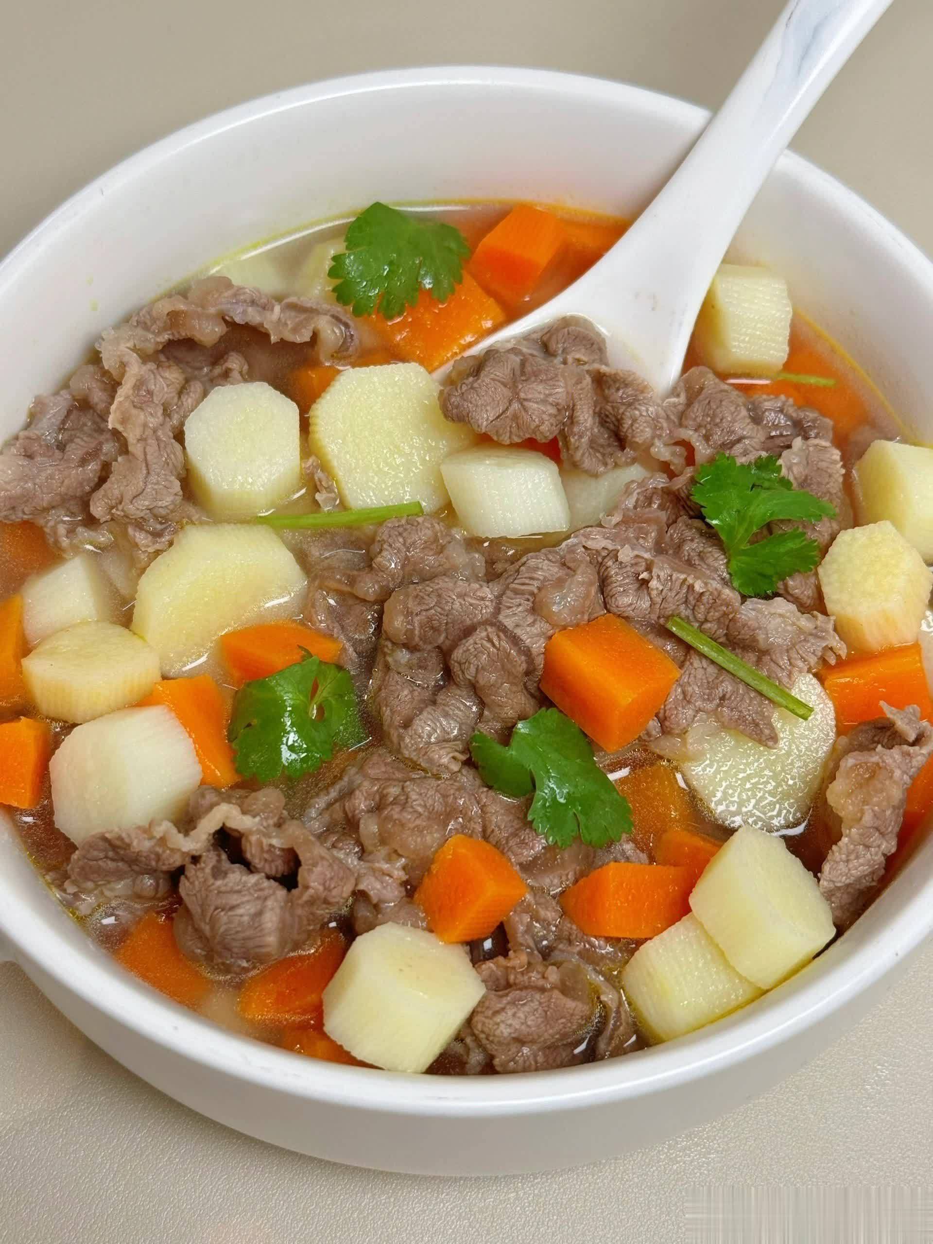牛肉补脾胃、益气血,胡萝卜富含维生素,能增强免疫力,这道菜有很好的益气养血功效。